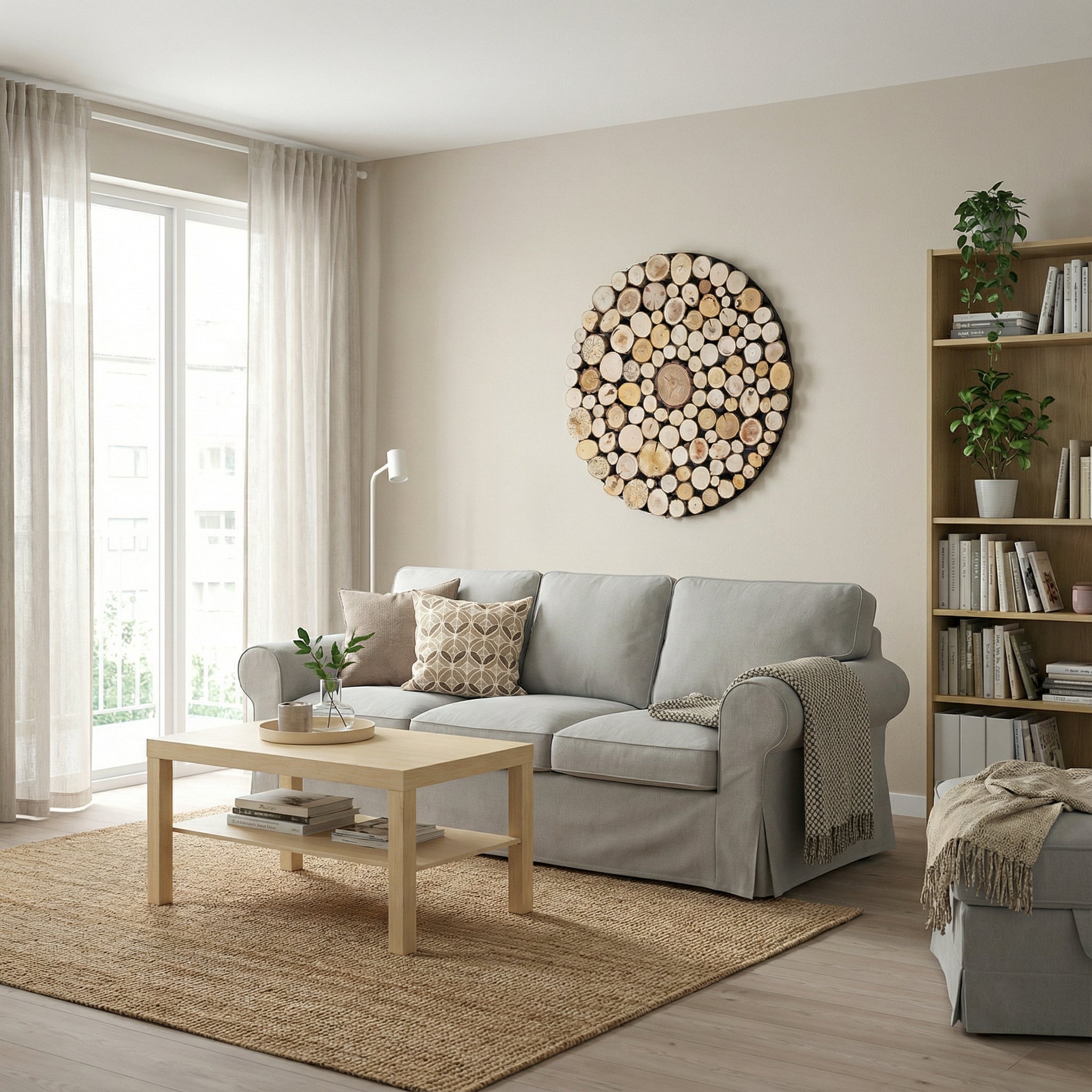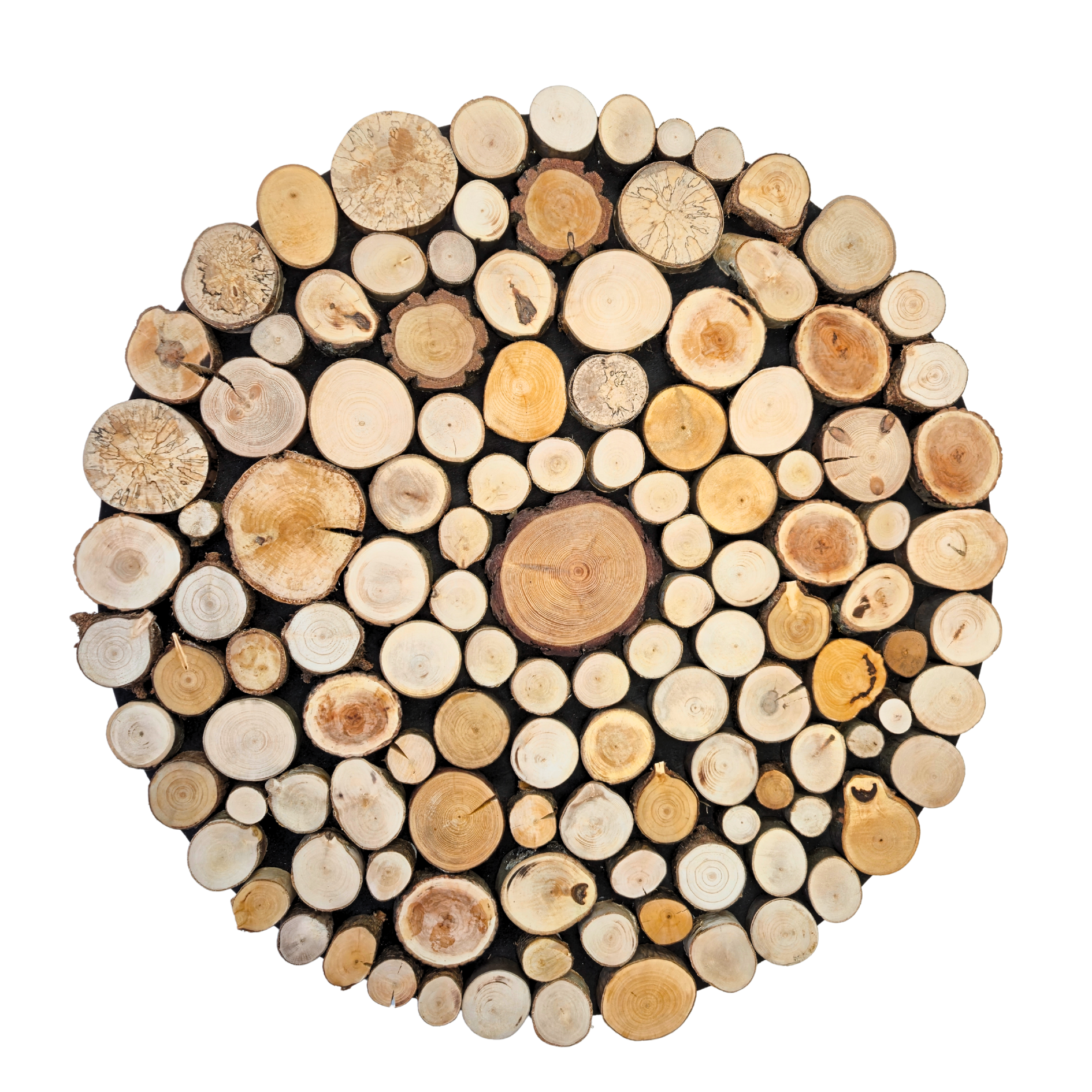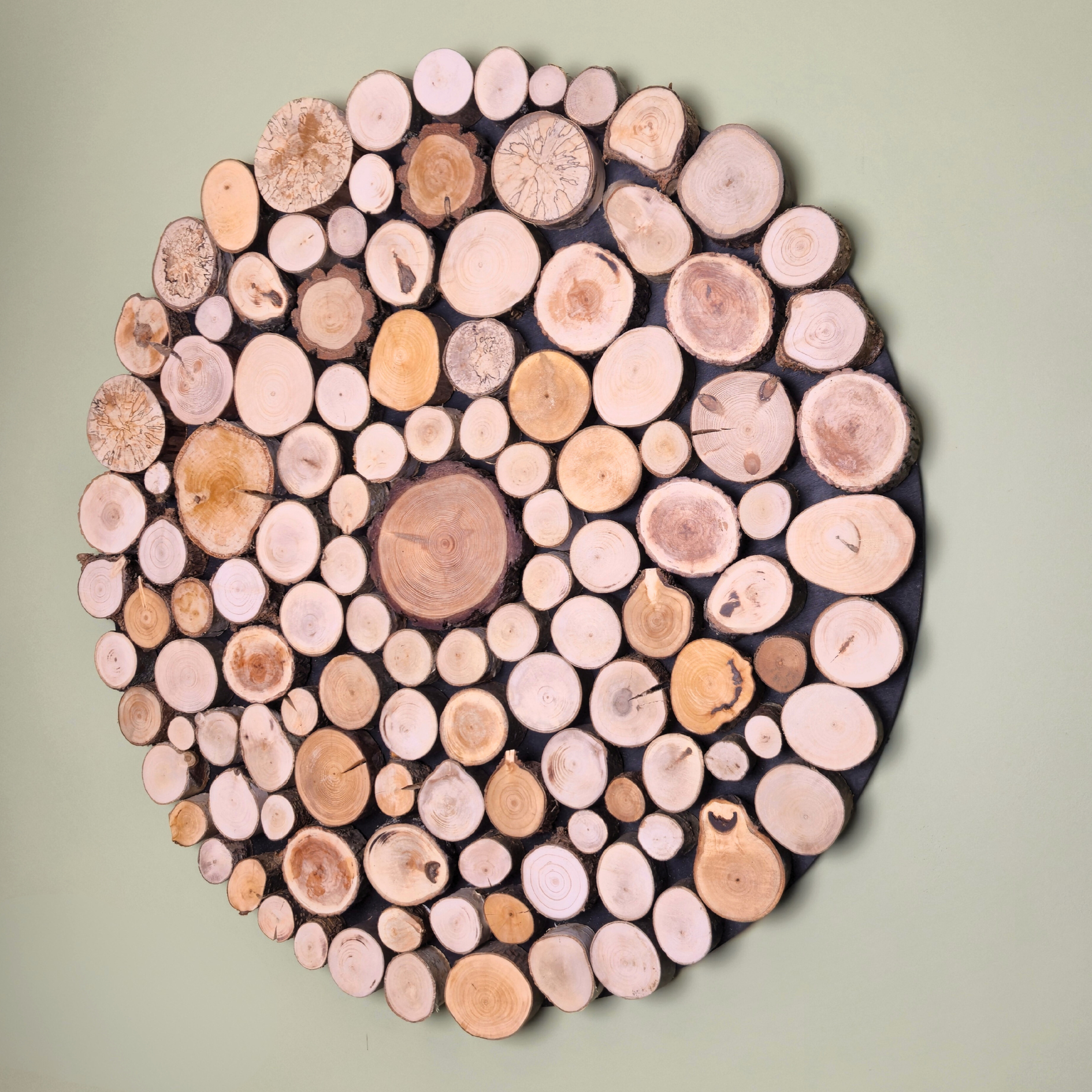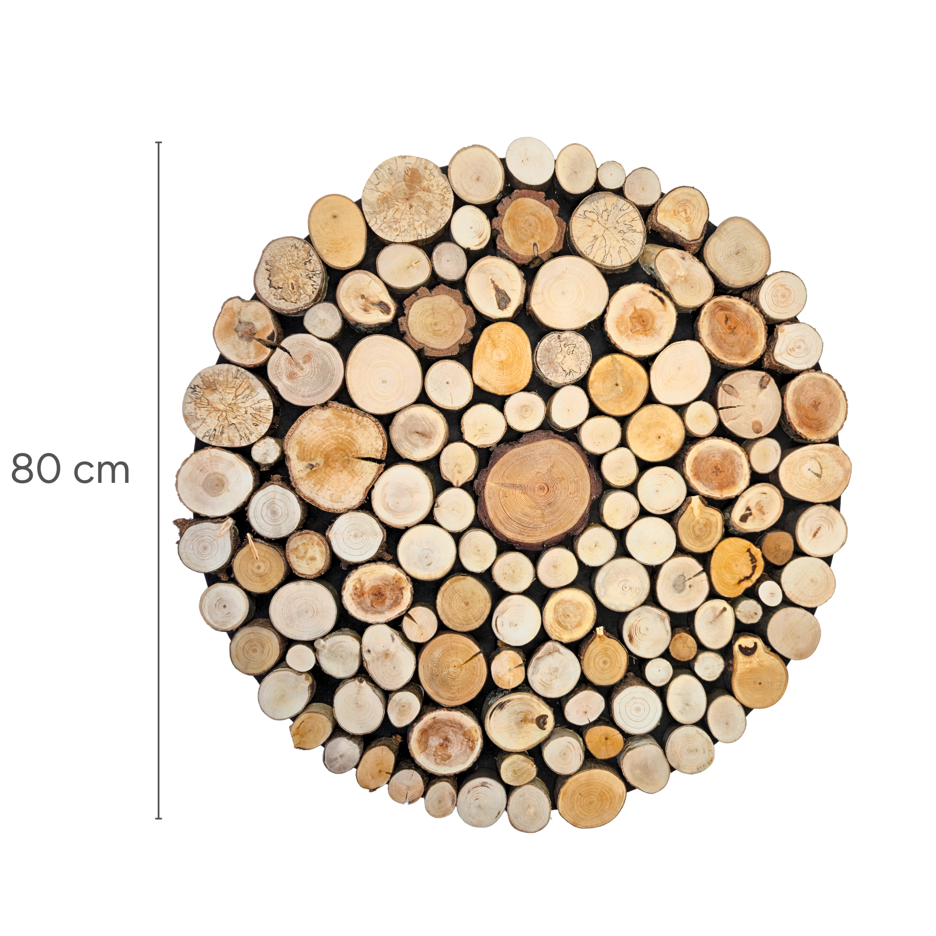 Okrągły obraz z plastrami drewna, krążków drewna o średnicy 80 cm. Naturalne drewno: sosna, brzoza, buk. Dekoracja ścienna nadająca wnętrzu ciepło i styl.
