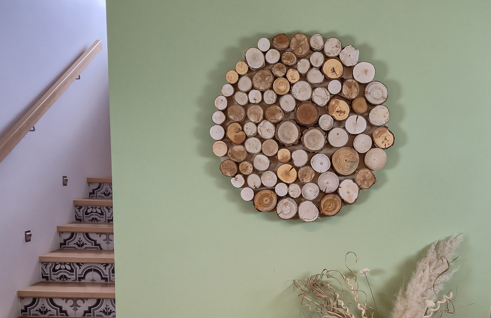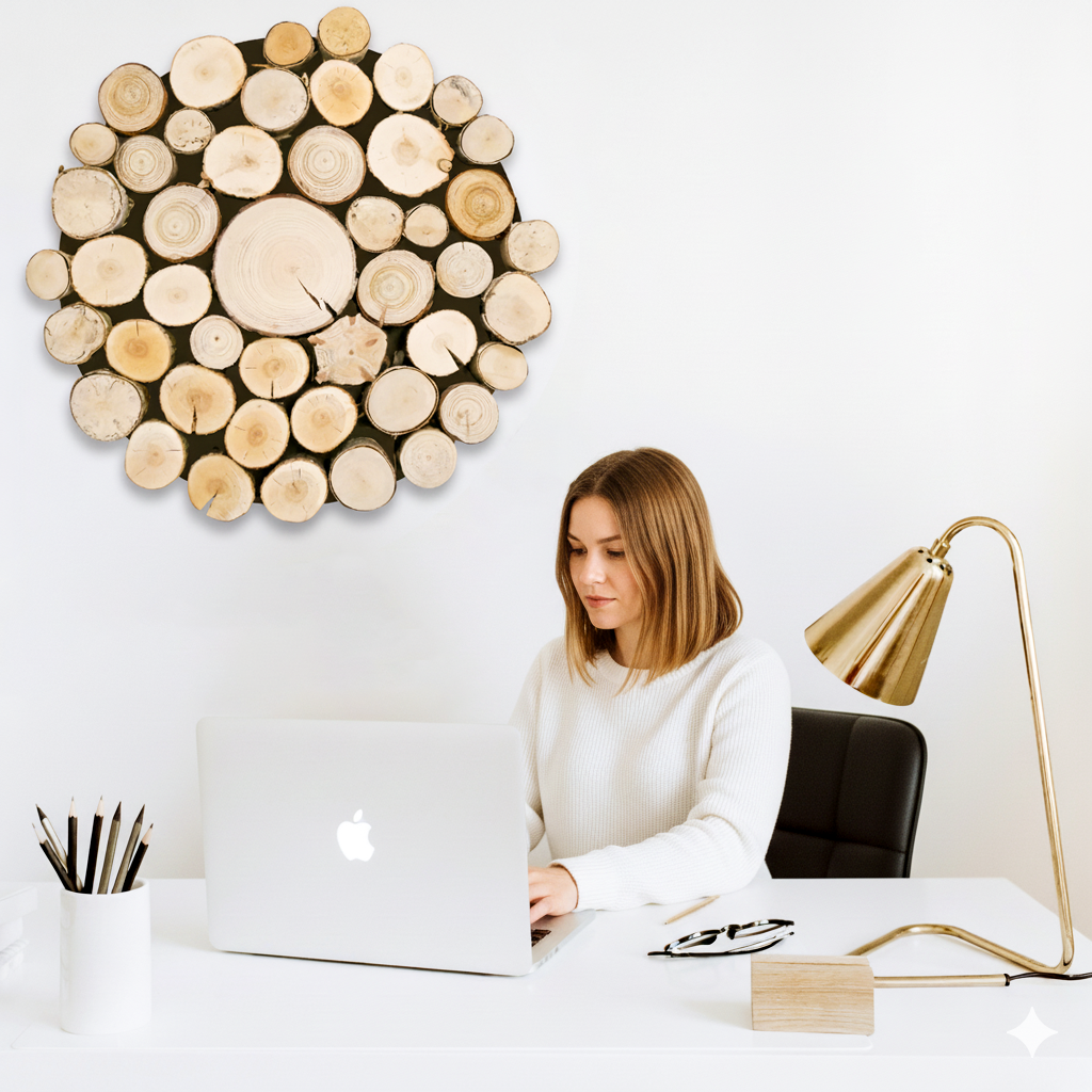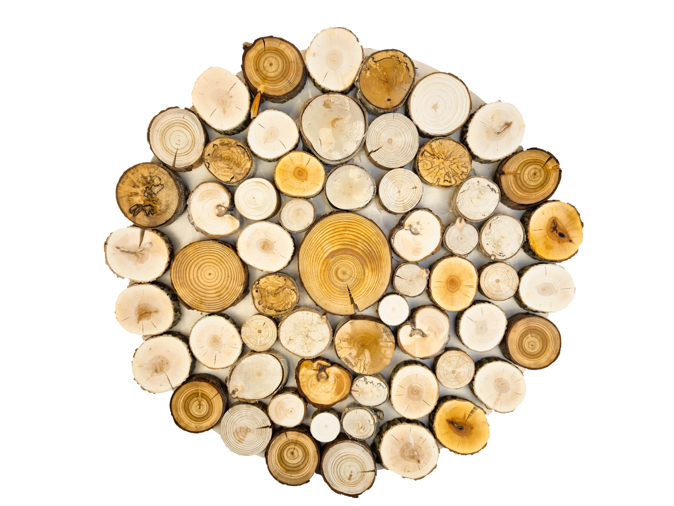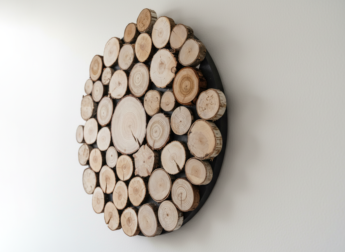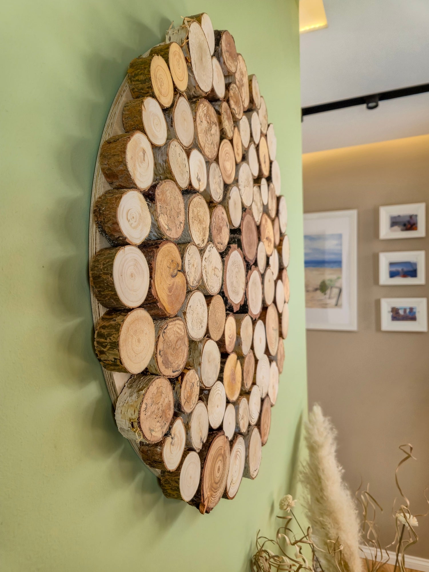 Dekoracja wykonana jest z naturalnych plastrów drewna, starannie ciętych i szlifowanych, dzięki czemu każdy egzemplarz ma swój niepowtarzalny charakter. Drewno pochodzi z polskich lasów – wykorzystujemy m.in. sosnę, brzozę oraz inne gatunki liściaste.